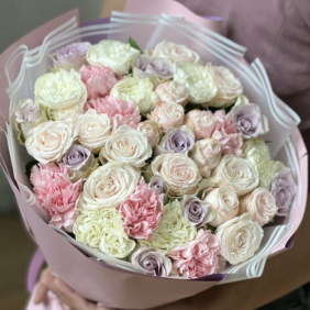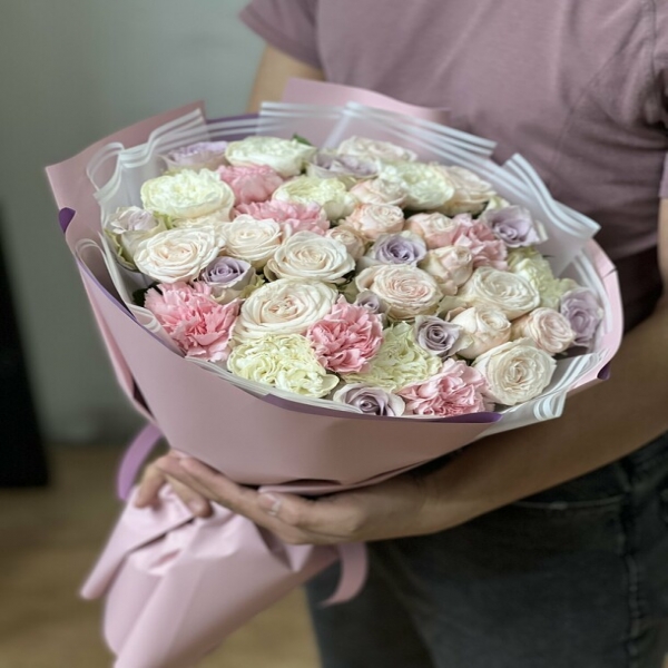 Ürün Kodu: FK-349AŞk Pembe lila beyaz Gül Buketi 51 Adet gül karanfil ile hazırlanmış şık bir buket