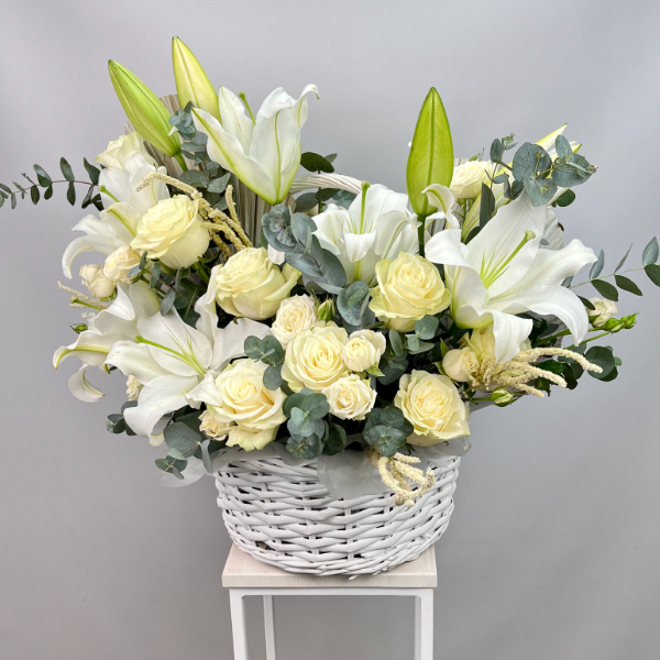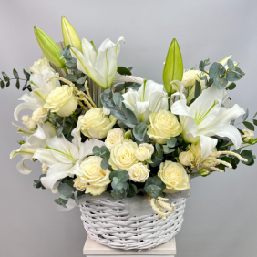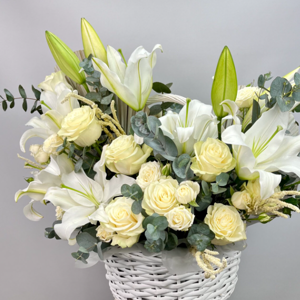 Ürün Kodu: FK-406Sepet içinde Beyaz kazablanka ve beyaz Gül okaliptus