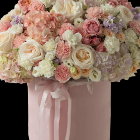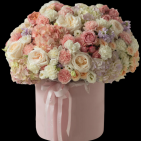 Produktcode: FK-351Arrangement aus rosa Rosen, Lisyantus, Mauerblümchen und Nelken in einem Korb