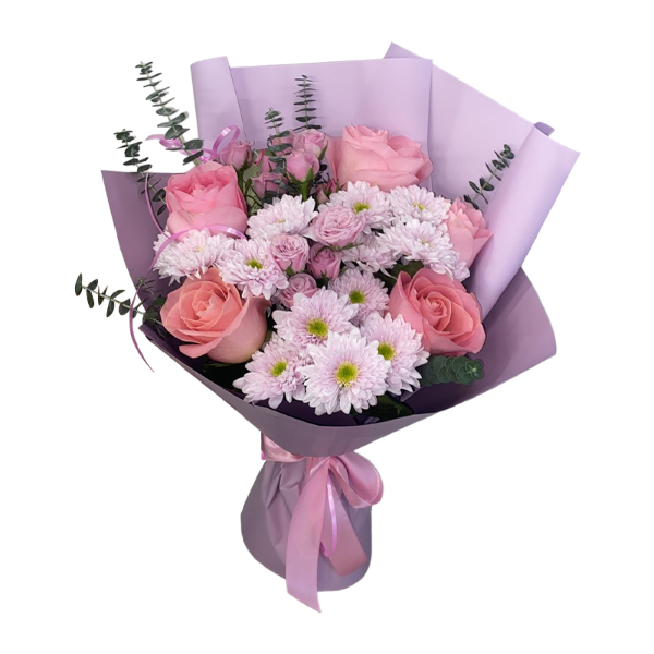 Produktcode: FK-396Blumenstrauß mit 5 Zweigen rosa Chrysantheme und 5 Zweigen rosa Rose und 2 Zweigen Eukalyptus