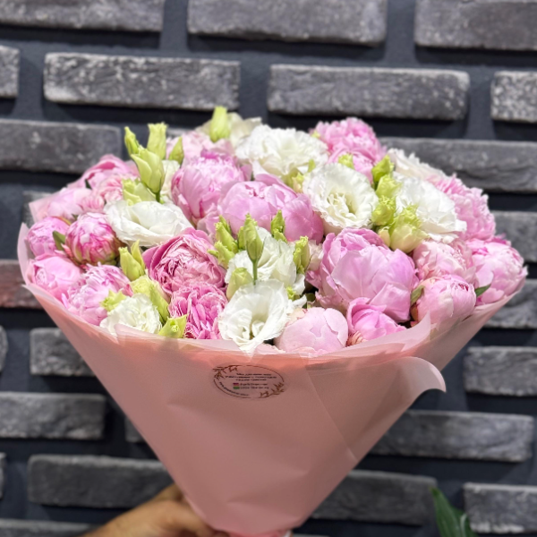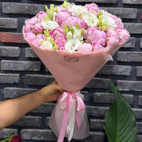 Код продукта: FK-339В букете 21 шт. розовых пионов и 11 шт. белых эустом