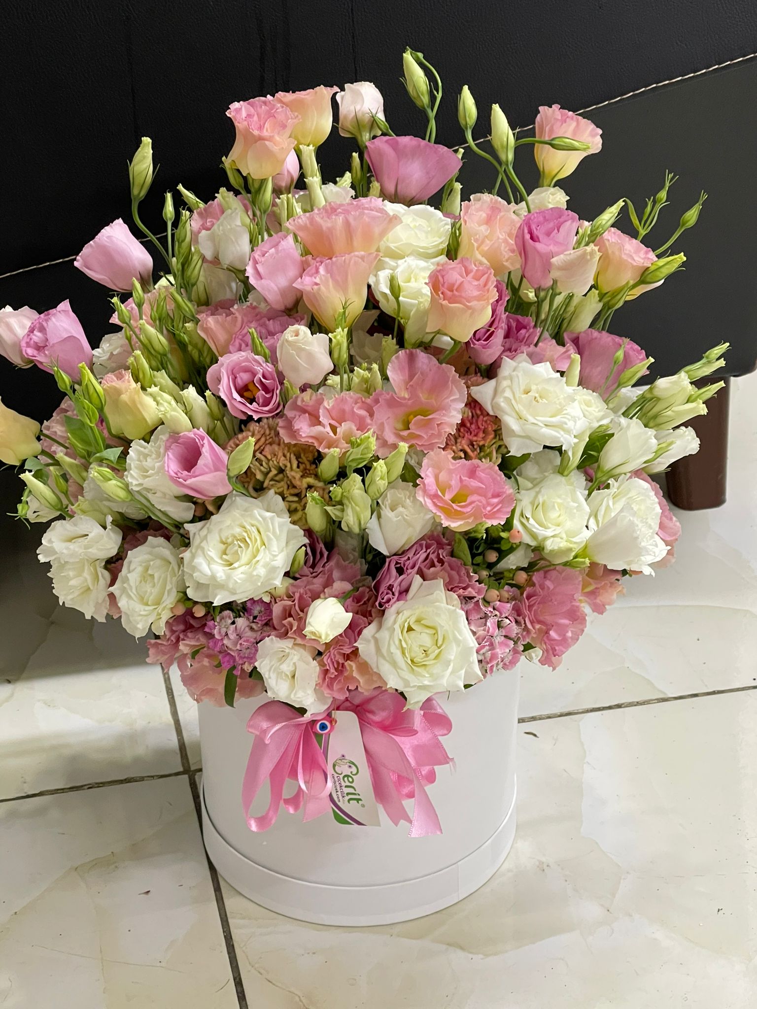 Kemer Çiçekçi Büyük boy XXL Kutu Aranjman Gül Lisyantus Krizantem sprey gül Kemer Çiçekçi Büyük boy XXL Kutu Aranjman Gül Lisyantus Krizantem sprey gül